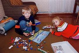 LEGOs continue to entertainLast time, I had also brought along a Lego set for Dzintars. Vija said she had never seen Dzintars, Mara, and their friends behave so well (cooperative, peaceful, and quiet!). In July, Dzintars had sent me a picture and letter asking for more Lego blocks. I ask you, how could I refuse his request => ? (Over for some more pictures Mara and Dzintars drew for us.) After dinner, we all gather: Mara, Velga, Dzintars, Erna, Gaida, my mom, and Laura. Mara and Dzintars play some more with the Legos (over), look through a picture album from my last trip with their mom Velga and grandma Gaida, and finally fall asleep together in their chair.
