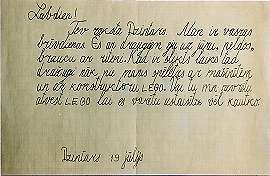 This is is Dzintars writing to you. I'm on summer vacation. I go with my friends to the beach, swim, and ride my bike. When it's bad outside then friends visit me to play with my cars and LEGO construction blocks. Couldn't you bring me LEGOs so I could build something more.