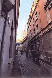 Back on the street, I'm still fascinated by the facades. Next, sadly, I succumb to the siren song of the narrow cobblestone streets. I head north along the Daugava and reach the Riga castle, the 13th century, and current, government seat. That's one of the castle towers straight ahead. Besides government offices, the more modern parts of the complex also house a number of museums.