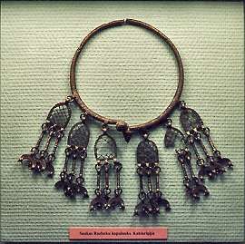 So, let's say you were dating a nice Latvian girl hundreds of years ago. What does a fellow give her for her birthday? The Latvijas vestures muzejs, the Latvian Historical Museum, was right around the tower. They were finishing up a new archeological exhibition. Here's the answer - a stylish choker necklace, and below, a headress for those special nights out when a girl wants to feel really elegant. And with those bells, a girl could always ring her escort to keep him close for safety in ancient, uncertain times.