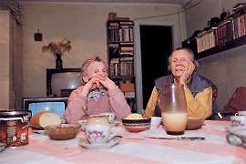 Paraphrasing Samuel Johnson, "The noblest prospect a Latvian can behold is the road that leads him to dinner." Chilled and hungry, I hurry back down the road. Tonight, Ruta would be our hostess. When we arrived, Aris was busy at work with his (new) Lego set. (No, I haven't hit the sauce yet, it only looks that way!) I was sorry to hear his sister Liene was sick in bed. We eat our fill of kotletes, sort of the Latvian equivalent of Swedish meatballs, potatos, lots of gravy, fresh milk, and bread you could use as a boat anchor. After dinner, Laura and my mom spot me trying to catch them chatting, while poor Ciepa (the dog) keeps hoping for scraps from Laura, with no luck. After dessert, we put the table away and gather for a photo. (I didn't mean to be so conspicous, I just couldn't find another seat before the self-timer went off.)