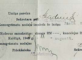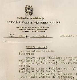 The mill house, much cleaned upThe place is looking good. We did an major cleanup a few days ago. Off came the rusted mailboxes and everything else nailed to the front. We cleaned up the outside and even raked off the grass growing on the porch roof. It's a good start. We were all kind of pictured out, so we just packed up and hit the road for Kuldiga, 30 km to the southwest, where my dad grew up. After my last trip, I sent copies of all my documents to do an archive search to put in a claim for the family land, Zelgi (ZEL-dyi). Now I had to file the search results in person. The total recorded land in 1939 was 109.79 "purvietas." But there was a net loss of 130 square meters in 1940, and my father's papers from 1943 (top next) show 51.385 hectares (127 acres), so I'm confused. Who knows, I might be a land baron complete with fishing rights, from the 1700's, to a piece of the waterfalls (to put out salmon baskets during their run)! Last, some more big sky (360°) along the way.