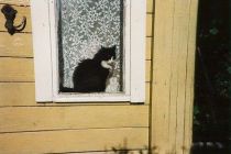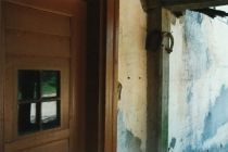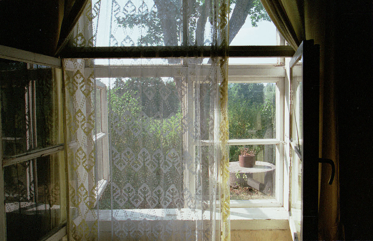We also spent some time out in the country. The old mill, "dzirnavas,"" was not doing well. Every year, a few more cracks appear, a bit more of the stucco where my grandfather painted the watermill's name falls off. The foundation is being washed out slowly by water leaking through a bad runoff pipe running under the road, from the lake. This led to some serious ditch digging, however, that's another story. I thought–well, actually, fantasized–that it might be possible to sell a few "artistic" pictures of the old mill as a way to help raise some money towards its repair. Here, the road winding past the front reflects off the front door's window panes.