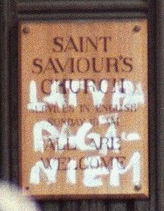 SAINT SAVIOUR'S CHURCHPainted over it, the Latvian words "LATVIJA PAGĀNIEM" — Latvia for the pagans.