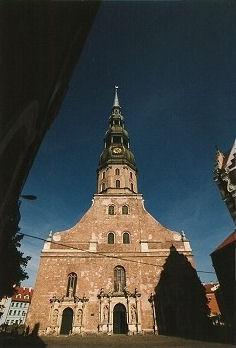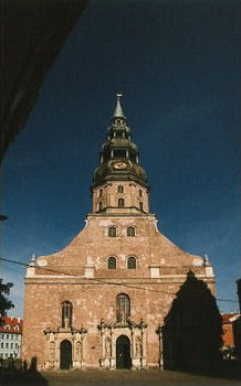 As you head in from the Daugava river towards the center of Riga's old Town, St. Peter's Church is one of the first sights you encounter. Originally built of wood in 1209, it was rebuilt in 1408 in stone. Steeped in history, it is said that Peter the Great himself helped fight the fire the first time its steeple burned down in 1721, and that he issued the edict for its reconstruction. It then stood for two more centuries before being burnt down again by the retreating Soviet army in 1941. The current steeple is a steel replica. After a reign of five and a half centuries as the tallest building in Riga, the (then Intourist) Hotel Latvija usurped the crown, its builders insuring they erected it one meter taller. Nevertheless, the ride to the observation platform still affords the best, if not highest, view of Riga.