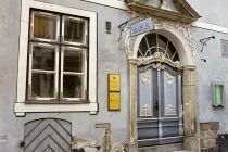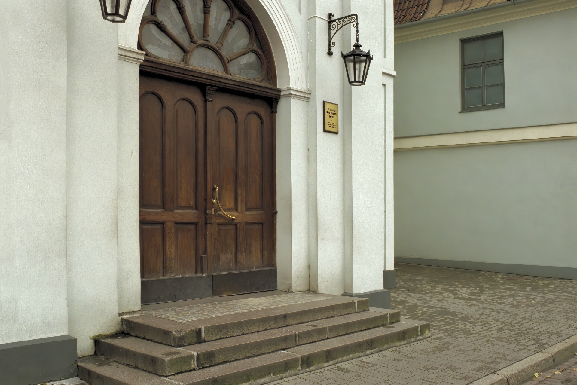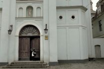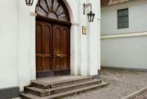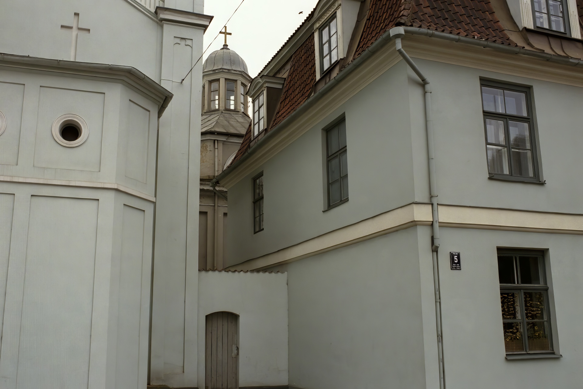At Pils iela 5 is Rīga's Sāpju Dievmātes baznīca (Our Lady of Sorrows Church). The building number sign is on the corner of the rectory, built in 1765.