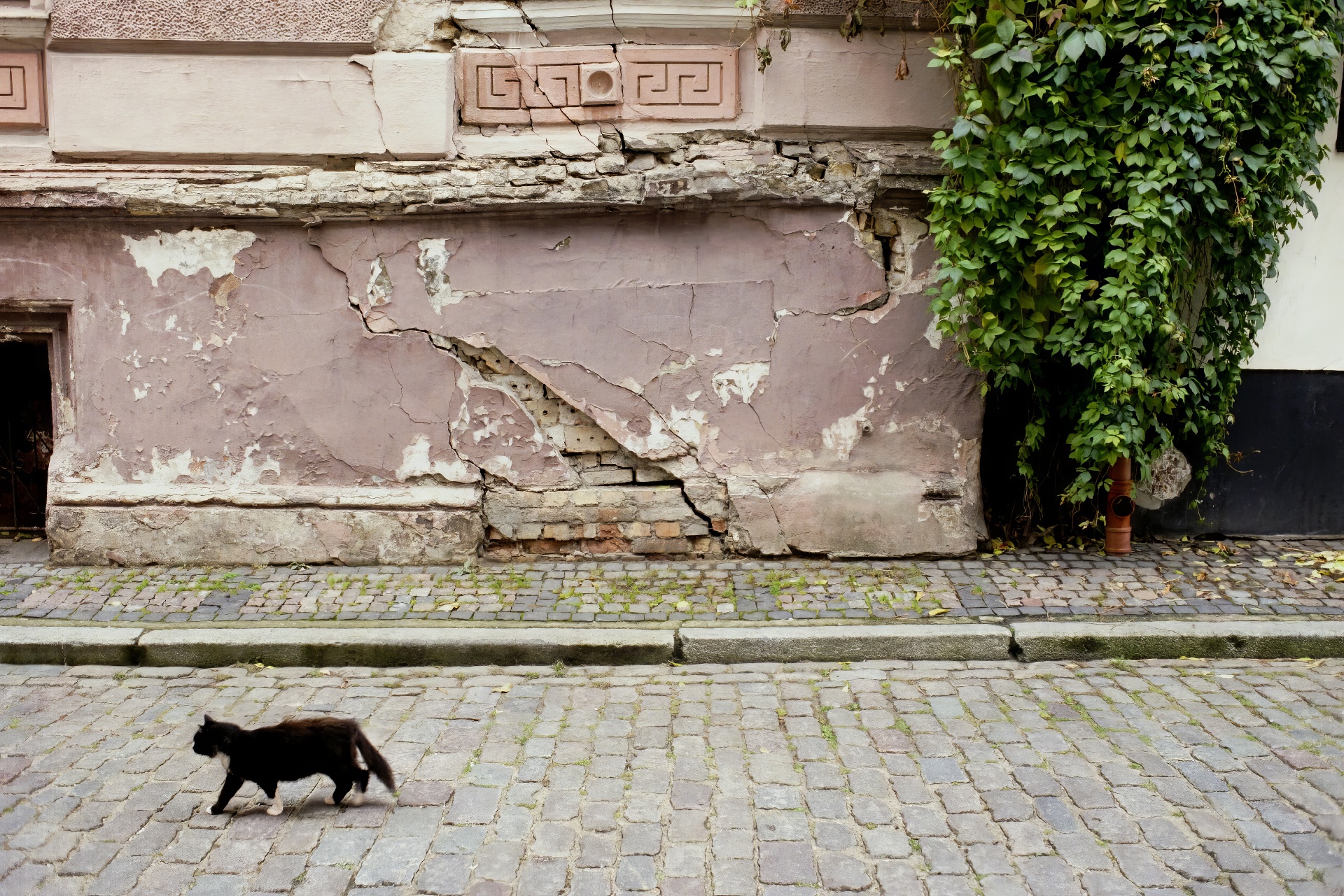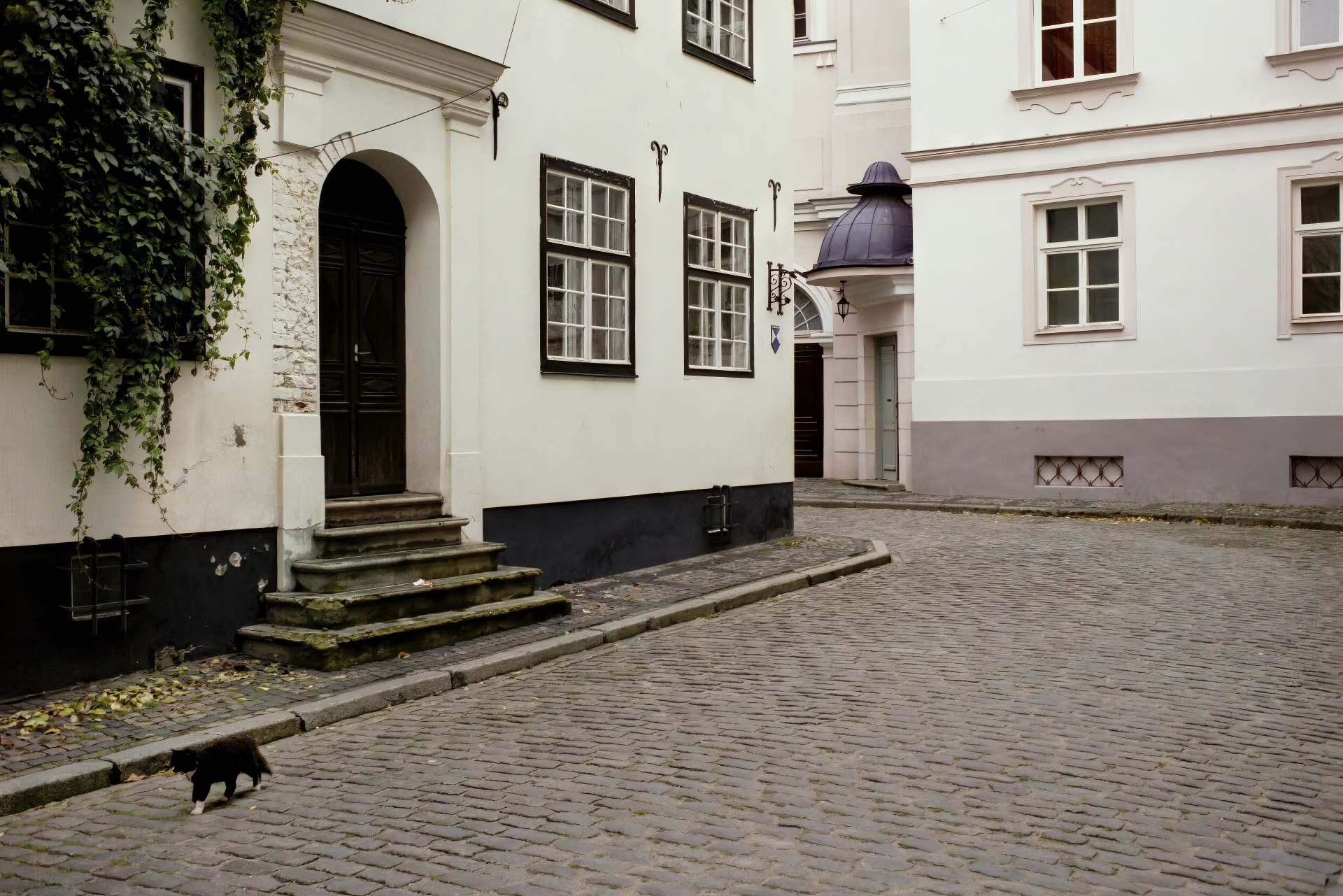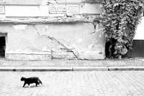 Black and white (paws) cat strolling along in Vecrīga