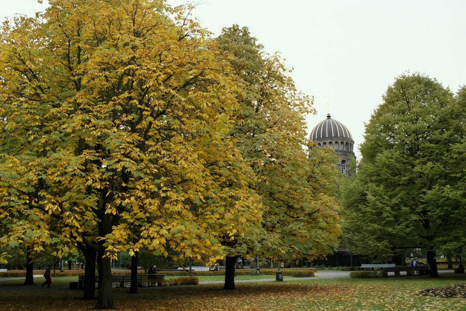 The dome of the Nativity of Christ Orthodox Cathedral rises above the Esplanade park