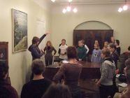 Spiritual guides, Gaŗa dzīves veidotāji, at center, walking-stick in hand, stands a seeker of knowledge, at his feet, a wizened soothsayer and a scholar seeking knowledge in writings.