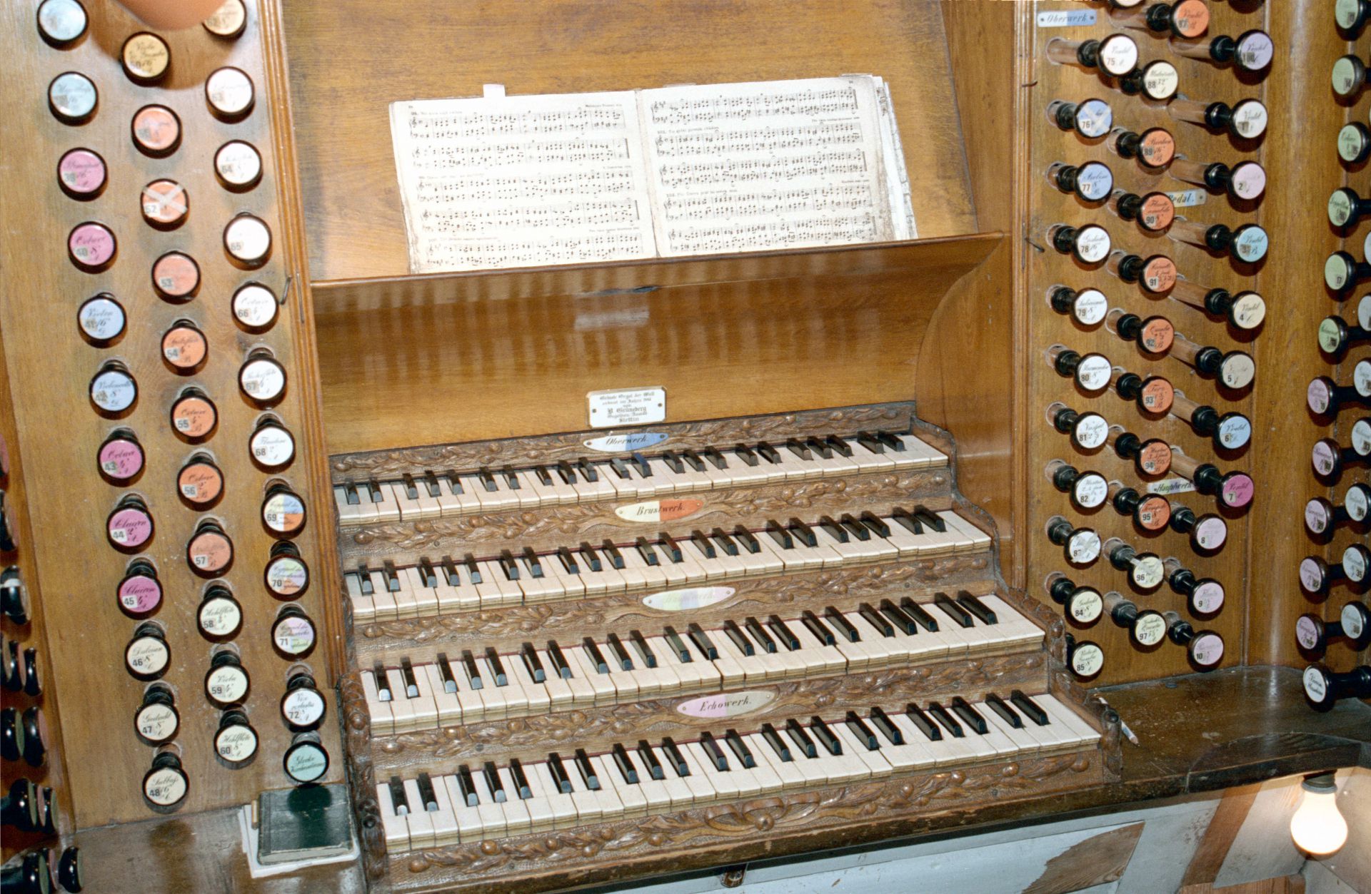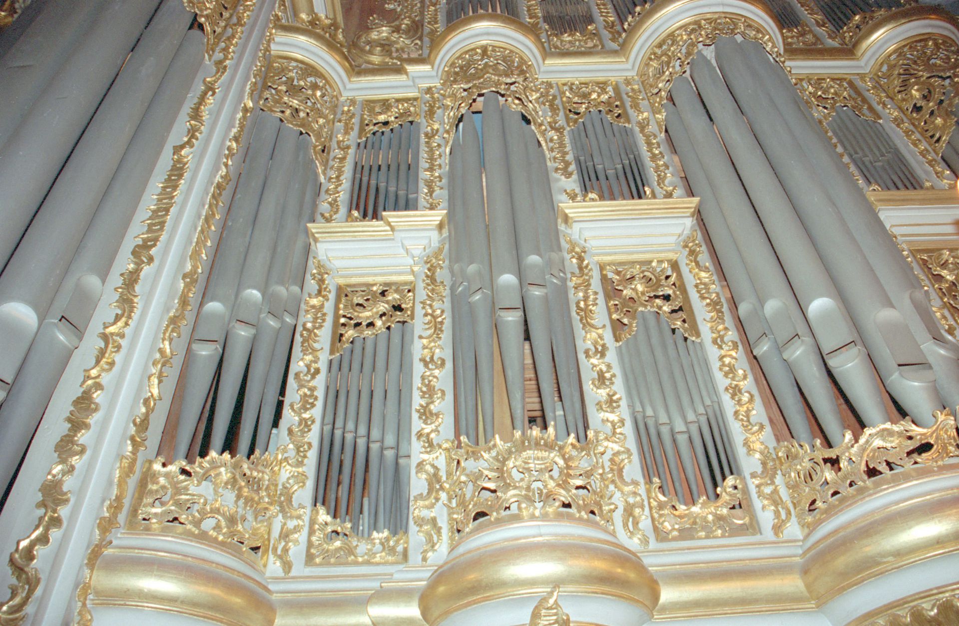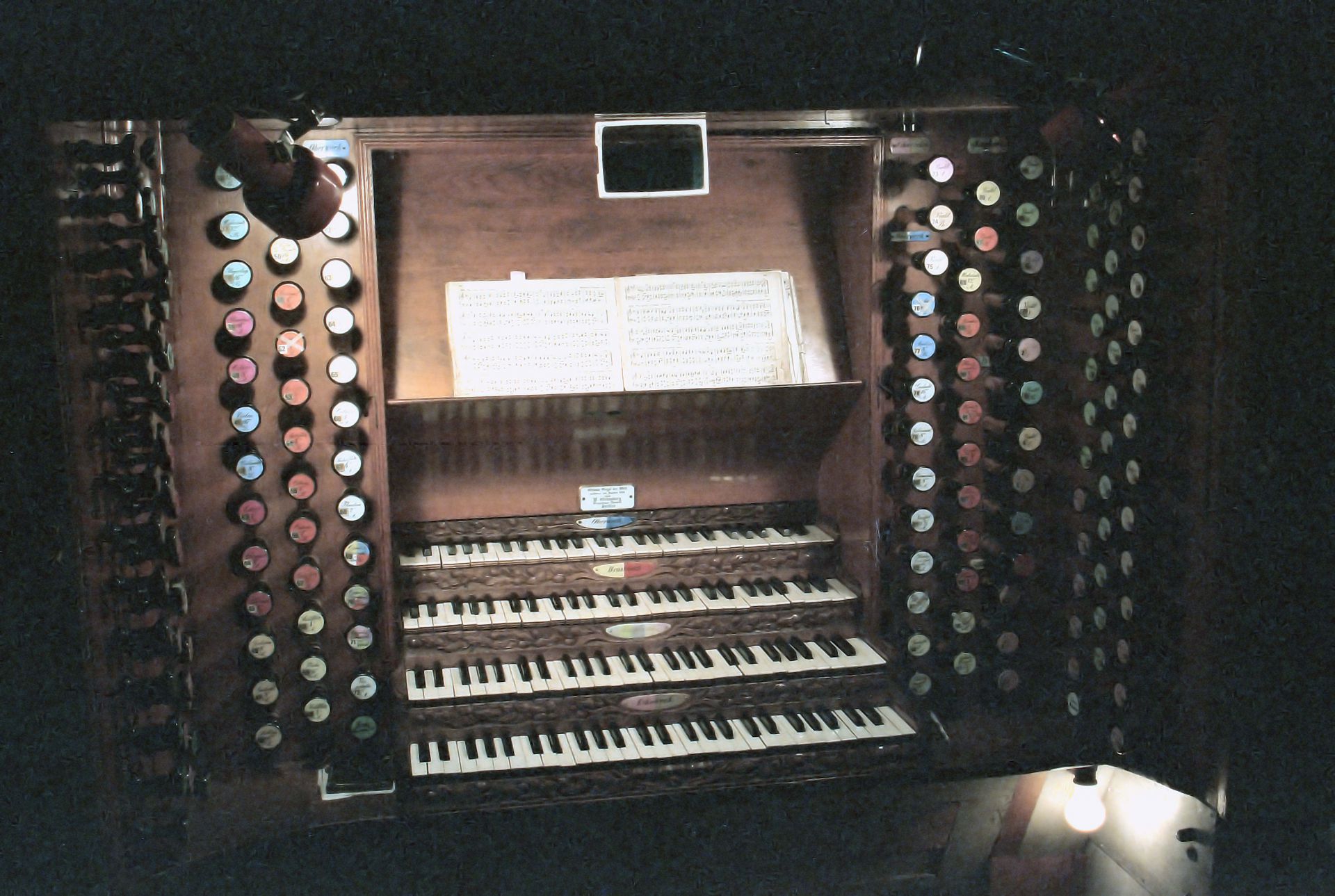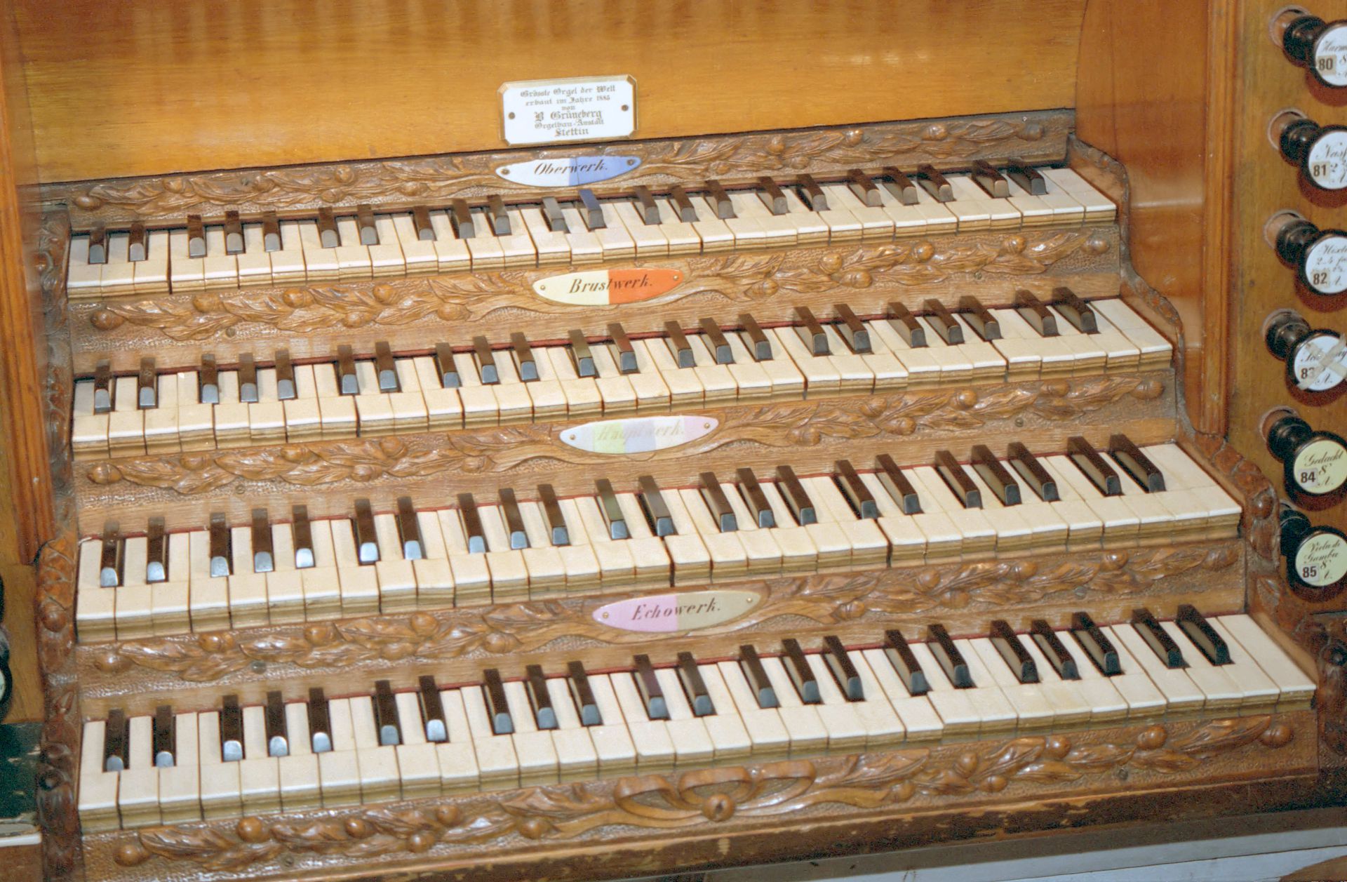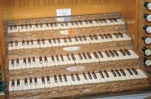 Liepāja, Holy Trinity church, the four manuals from top to bottom: Oberwerk, Brustwerk, Hauptwerk, and Echowerk