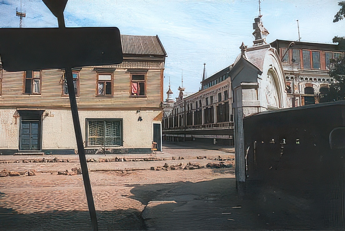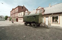 Liepāja, an old wagon parked along a side street, oherwise a scene likely not changed in nearly a century