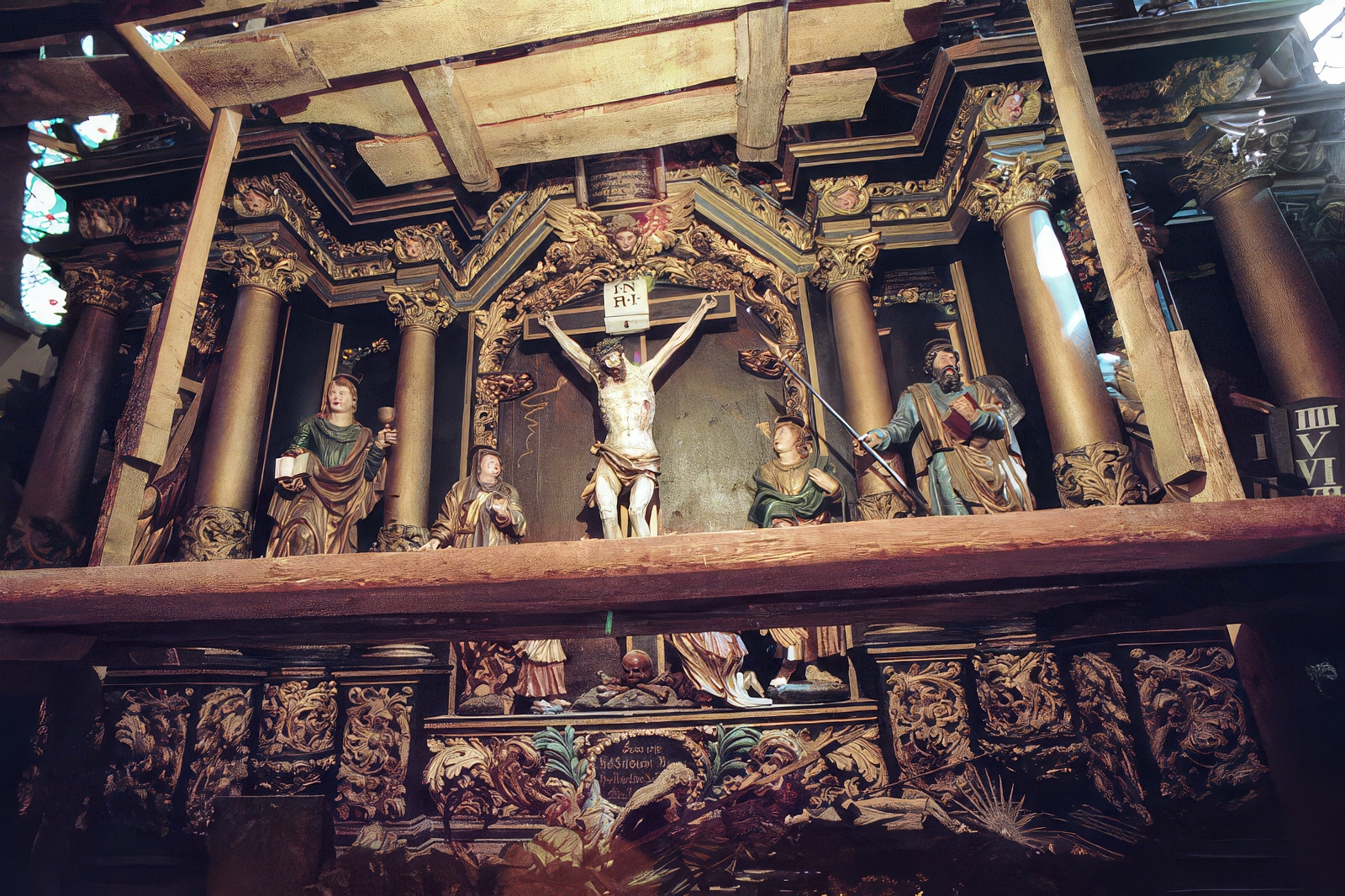 Liepāja, Annas church, detail of the altar crucifix, looking in under the wraps