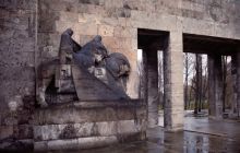 Brāļu kapi entrance, flanked by horsemen on the left
