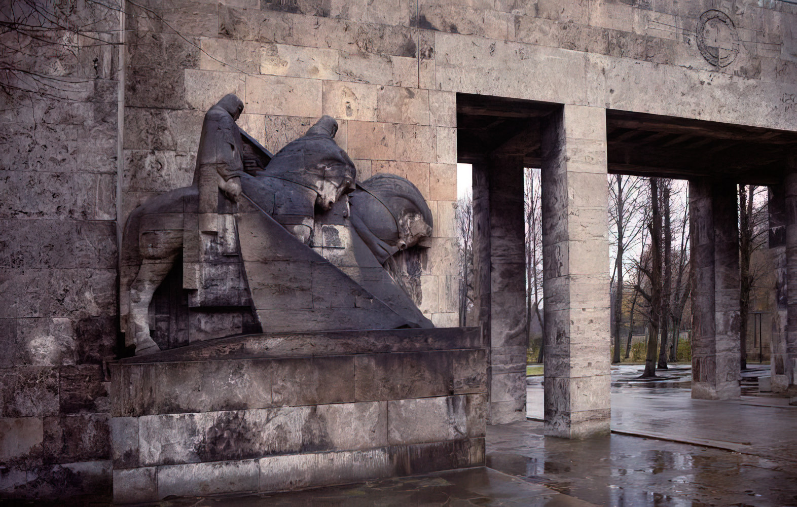 Brāļu kapi entrance, flanked by horsemen on the right