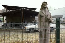Stereotypical Soviet robed, robes flying, outreaching heroic figure—once you've seen one Soviet victory memorial, you've seen them all