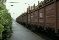 Instead of taking the Brasas bridge, I head down to the tracks and station—a freight train of lumber trundles toward the port