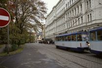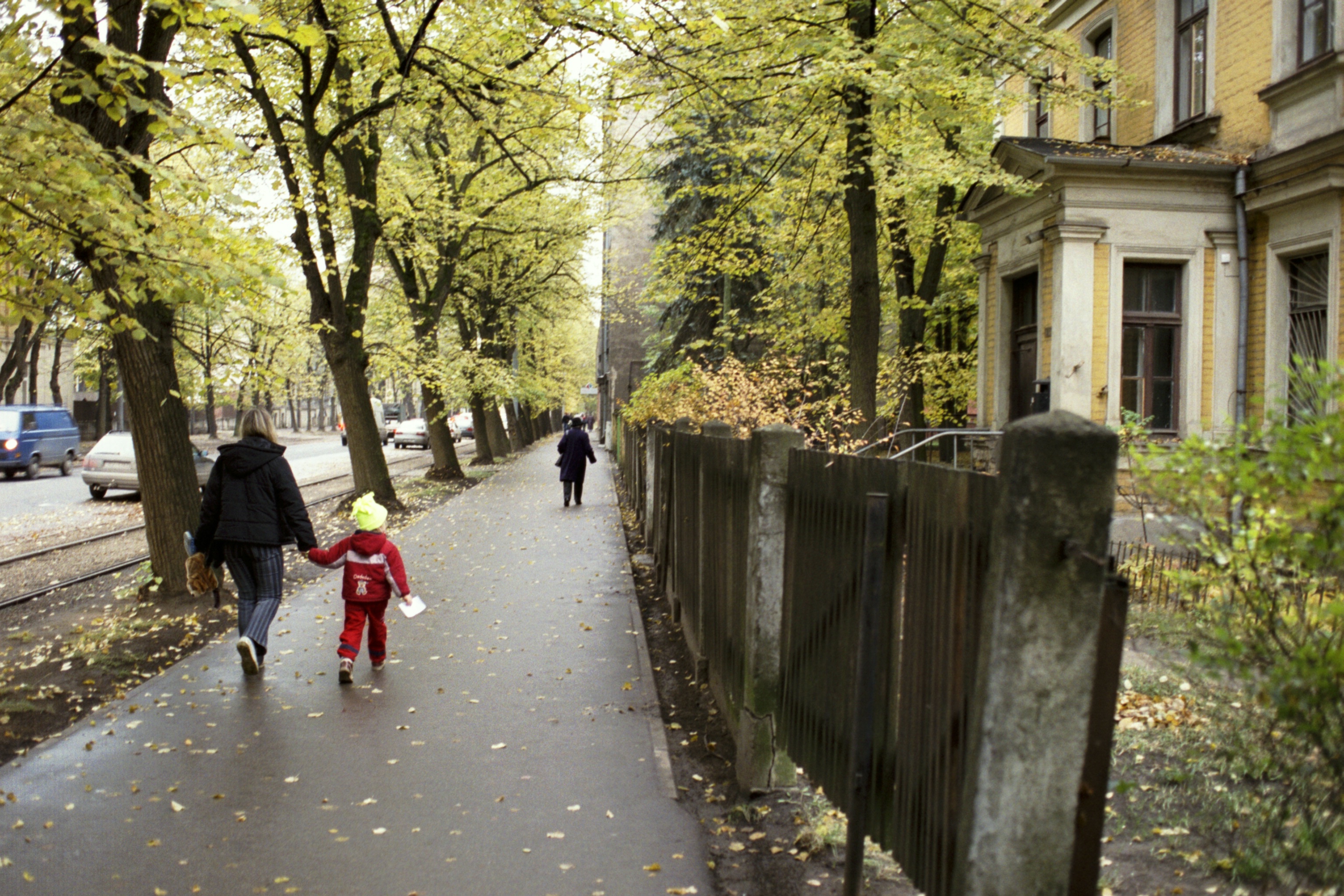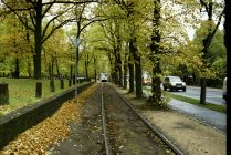 The sidewalk narrows as the tram speeds by, to the left is Rīga's Lielie kapi, Great Cemetery.