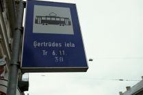Continuing, we pass the MĒNESS iela stop. In the opposite direction, you can see the ĒVELES iela stop. (Mēness = moon, Ēveles = a carpenter's plane's)