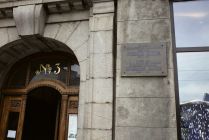 Across the street, Soviet-era apartment blocs.