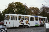 At RUSOVA iela the #11 turns on to Ķīšezera iela; the graffiti, aside from NE-, "not," Rusova street, reads "NO TO REFORM!!!" This could have been related to language reform in 2004, that at least 60% of school classes be taught in Latvian.